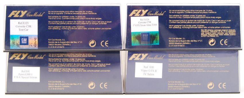 A collection of 4x original contemporary  1/32 Scale 'Fly Car Model' plastic model slot cars to include; E91 Panoz LMP1, E81 Viper GTSR, A124 Corvette C5r & E121 Corvette C5r. All within their original plastic cases.
