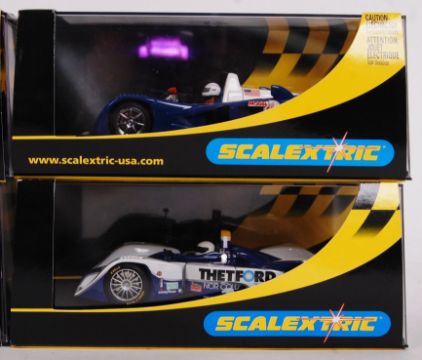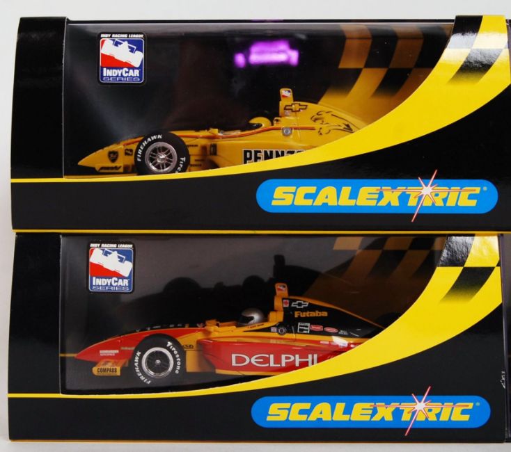 A collection of 4x original contemporary 1/32 scale Scalextric plastic racing slot cars to include; C2442 Dallara Indy, C2426T Cadillac Northstar LMP, C2498 Dallara Indy & C2483 MG Lola. All within their original plastic cases.