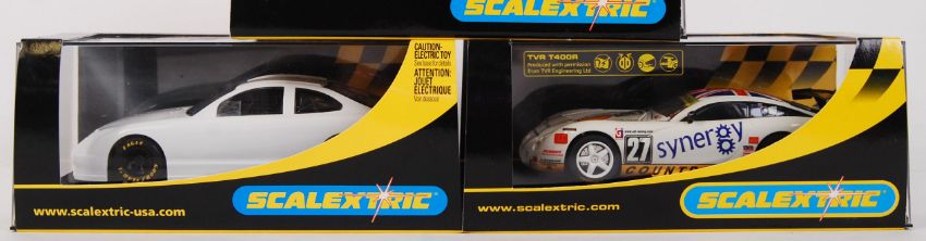 A collection of 3x original contemporary 1/32 scale Scalextric racing slot cars to include; C2590 TVR Tuscan 400R, C2327TF Pontiac Grand Prix & C2274 Porsche 911 GT3R. All within their original plastic cases with cardboard sleeves. Mint.