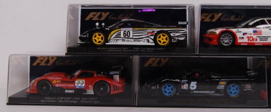 A collection of 5x original contemporary Fly Car Model 1/32 scale plastic model slot cars to include; A282 BMW M3, A362 Marcos LM 600, A264 Saleen S7R, A56 Porsche 911 GT1 & A262 Saleen 57. All within their original plastic cases.