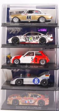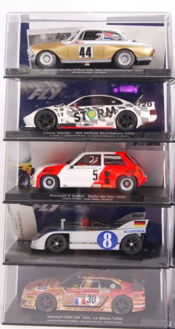A collection of 10x original contemporary 1/32 scale Fly plastic racing slot cars to include; 88215 Alfa Romeo, 88207 Lister Storm, 88246 Renualt 5, 88128 Venturi 600, 99086 BMW, 88214 Porsche, 88252 Alfa Romeo, 88248 Porsche & 99018 Porsche 911. All within their original plastic cases.