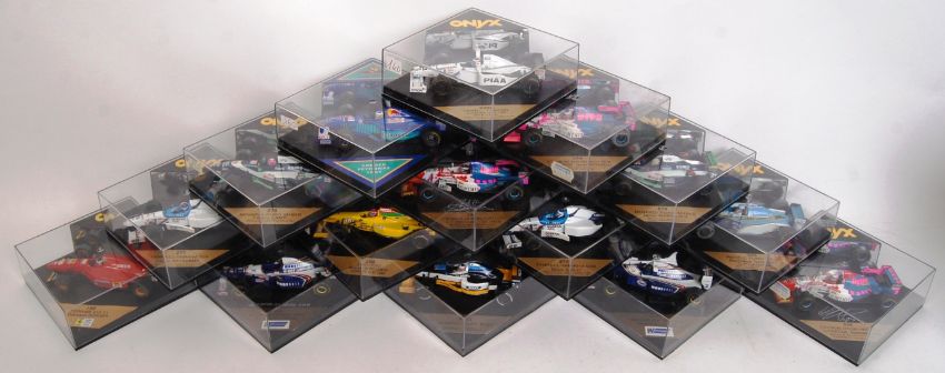 A collection of 15x original 1/43 scale ONYX diecast model F1 Formula One racing cars to include; 276, 288, 258, 257, 279, 243, 303, 202C, 305, 256, 259, 278, 277 & 190. Mint. All within their original plastic cases.