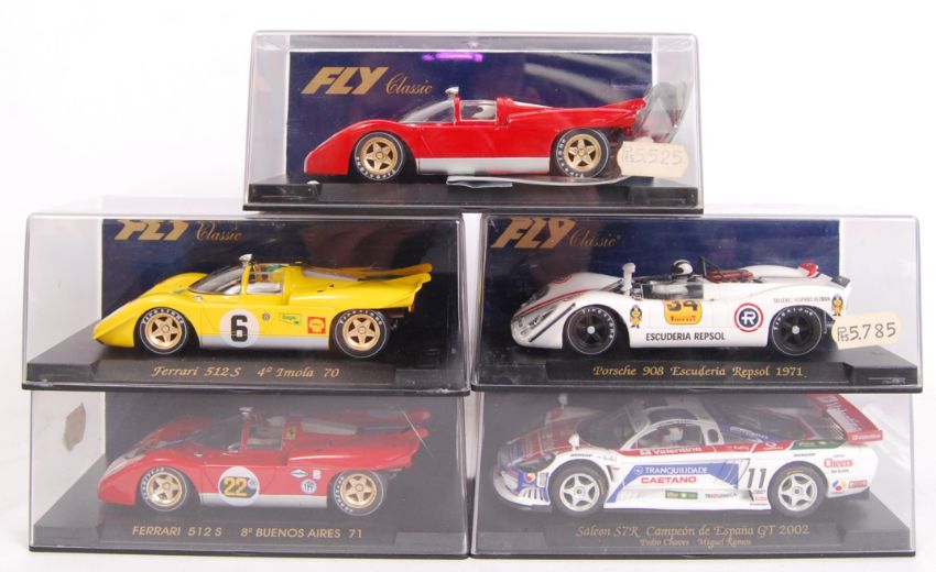 A collection of 5x original contemporary 1/32 scale Fly Car Model plastic racing slot cars to include; C17 Porsche 908, A266 Saleen S7R, C4 Ferrari 512 S, C2 Ferrari 512 S & C3 Ferrari 512 S. All within their original plastic cases.