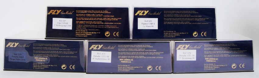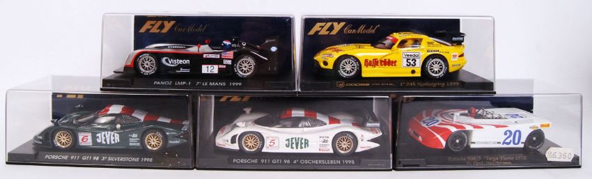 A collection of 5x original 1/32 scale Fly Car Model plastic racing slot cars to include; A91 Papnoz LMP-1, A74 Porsche GT1, A75 Porsche GT! 98, C65 Porsche 908/3 & A87 Viper GTS-R. All within their original plastic cases.