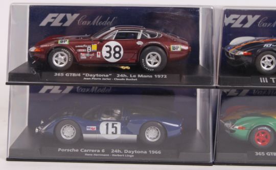 A collection of 4x original contemporary 1/32 scale Fly Car Model plastic racing slot cars to include; A654 365 Daytona, A1602 Porsche Carrera, E652 Ferrari Daytona & A658 365 Daytona. All within their original plastic cases.