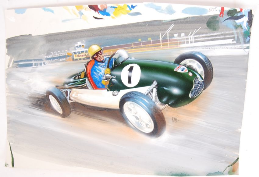 A fabulous and original painting of a 1951 Cooper Norton racing car with driver. Painted in watercolour, pastel and other media. Signed by artist Mike Francis ' Francis .'  NOTE: From a rare collection of original Mike Francis artwork for Castella Cigars ' Donington Collection ' cigar / cigarette cards and the accompanying album. Each piece is roughly 25cm x 40cm (some odd sizes). All appear centrally finished, and many have annotations such as page or size references to the margins. Each painting shows fabulous detail, many with famous drivers accurately represented. These were, at one point, on display in the Donington Racecourse Museum.