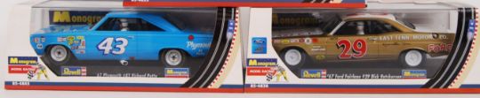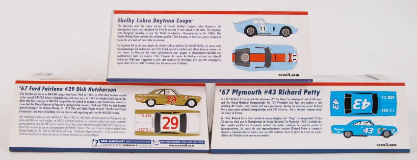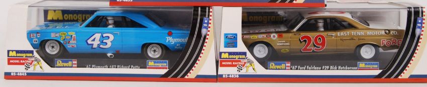 A collection of 3x original contemporary 1/32 scale 'Monogram Model Racing' plastic racing slot cars to include; 85-4845 '67 Plymouth #43 Richard Perry, 85-4835 Shelby Cobra Daytona Coupe & 85-4836 '67 Ford Fairlane. All within their original boxes with outer cardboard sleeves.