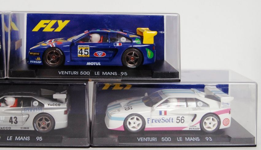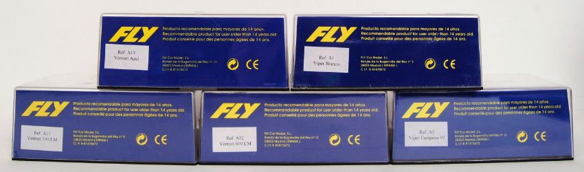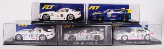 A collection of 5x original contemporary 1/32 scale Fly plastic racing slot cars to include; A1 Viper Blanco, A5 Viper Campeon, A12 Venturi 600 LM, A11 Venturi 500 LM & A13 Venturi Azul. All within their original plastic cases.