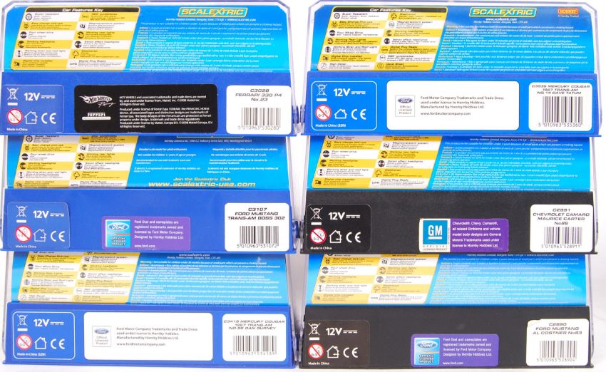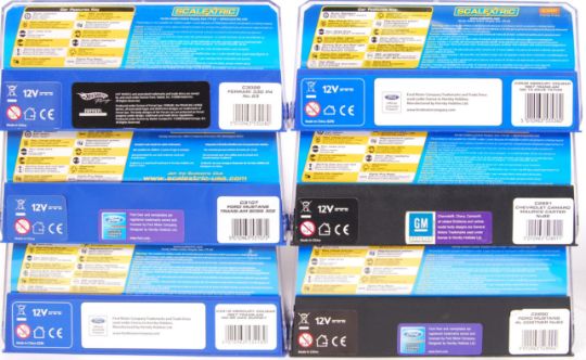 A collection of 6x original contemporary 1/32 scale various Scalextric plastic slot racing cars to include; C3028 Ferrari, C3107 Ford Mustang, C3418 Mercury Cougar, C3536 Mercury Cougar, C2891 Chevrolet Camaro & C2890 Ford Mustang. All within their original plastic cases.