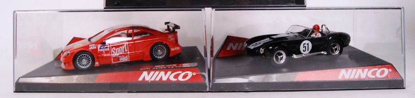 A collection of 3x original contemporary 1/32 scale Ninco plastic racing slot cars to include; 50527 Subaru WRC, 50207 AC Cobra & 50268 Opel Astra V8 Coupe. All within their original plastic cases.