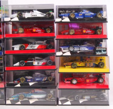 A large collection of 30x original 1/43 scale Minichamps diecast model F1 Formula One racing cars. Mint. All within their original plastic cases.