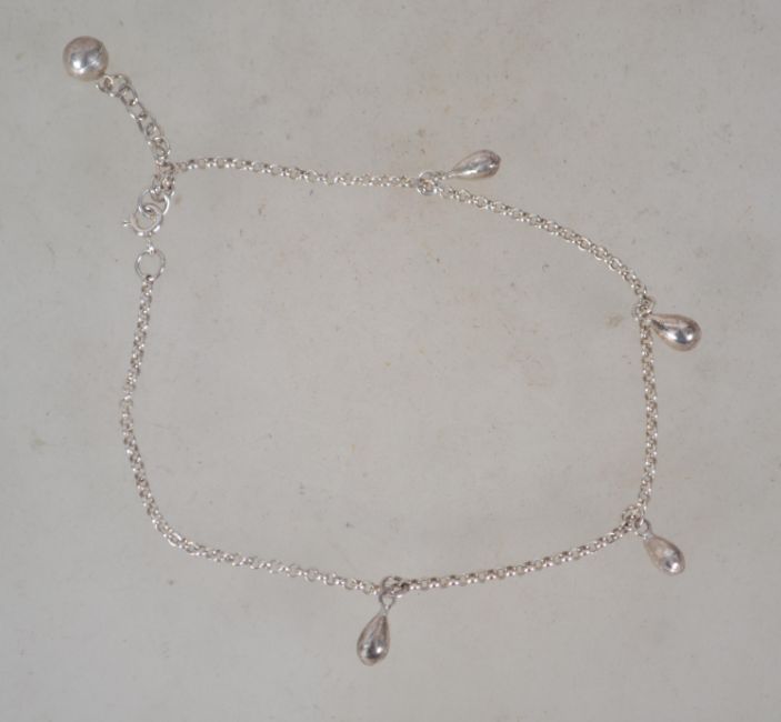 A sterling silver ankle bracelet having pendant drops and a small silver bell with a bolt ring clasp. Marked 925 weighs 4.3 grams and measures 26.5cms long.