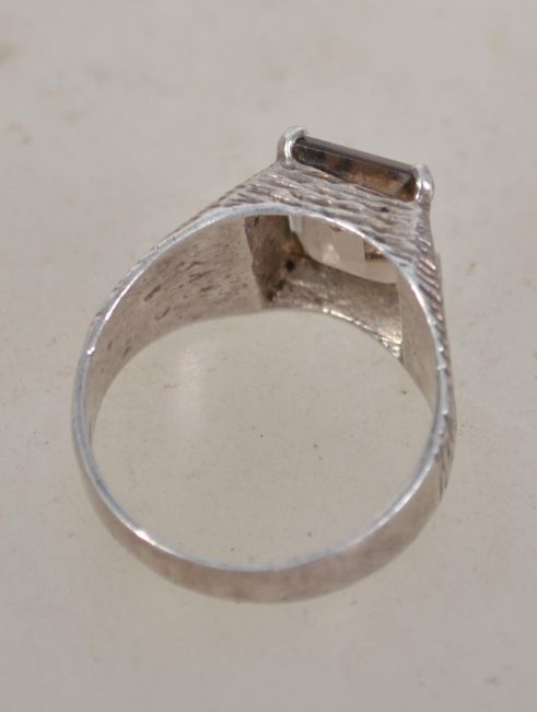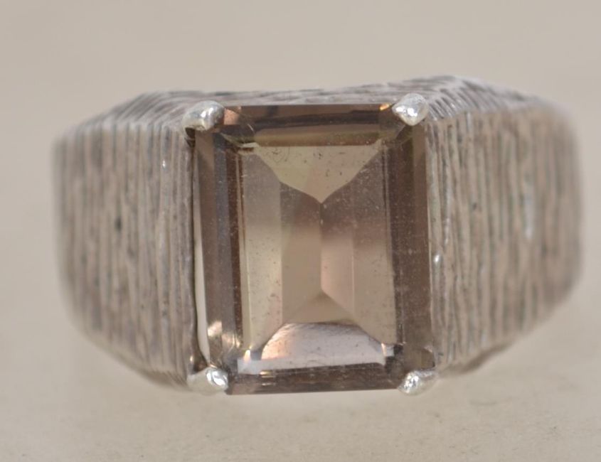 A sterling silver 925 modernist Brutalist ring having naturalistic bark effect shoulders with a central smokey quartz stone. Weighs 4.4 grams size N.