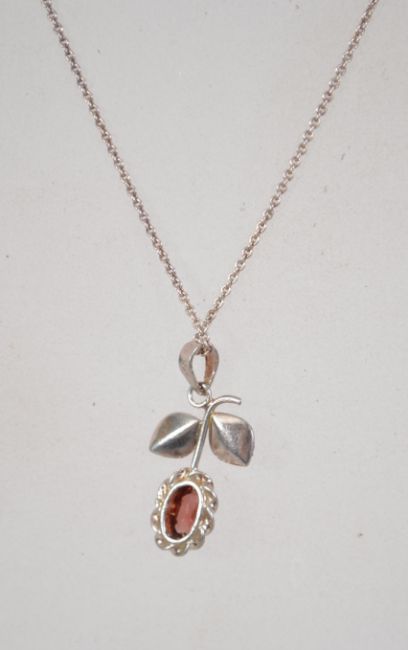 A vintage silver pendant on chain in the form of a flower set with a garnet stone with gold washed leaves. Marked 925 weighs 1.76 grams chain measures 43cms long pendant measures 2cms.