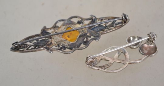 A sterling silver 925 Art Nouveau style brooch having leaf design with central amber cabochon with rollover catch along with another Art Nouveau style brooch. Total weight 10 grams.