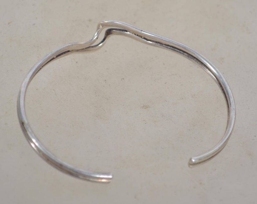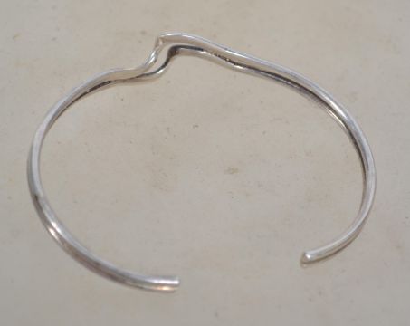 A sterling silver bangle bracelet of crossover form. Rubbed hallmarks. Weighs grams measures 6.5cms wide.
