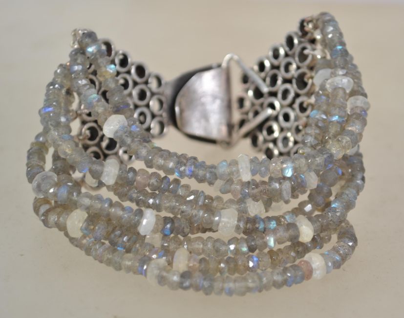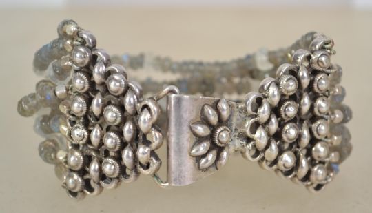 A sterling silver 925 and bead multi strand bracelet chain with floral motif to clasp. Weighs 64 grams and measures 8 inches long.