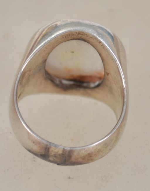 A sterling silver 925 signet ring having central mother of pearl panel. Weighs 13.6 grams size T.