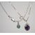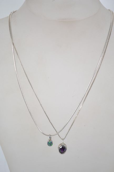 Two sterling silver necklace chains one being a box link chain with bolt ring clasp having a faceted amethyst drop pendant and the other being a snake link chain with claw clasp having an iridescent stone drop pendant. Total weight 10.1 grams.