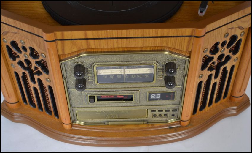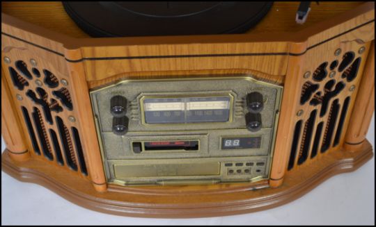 A Steepletone oak cased antique style hi-fi with inset record deck, cd, radio and tape deck. Bought and never used, the record deck still in packing
