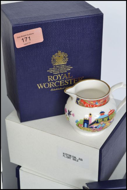 Royal Worcester jugs - a set of twelve 250th Anniversary jugs decorated in 18th to 20th Century patterns, various sizes, Worcester marks and informative dates complete in original boxes.