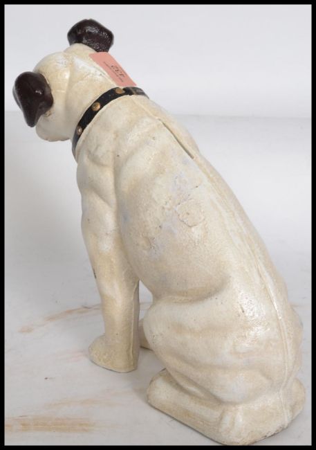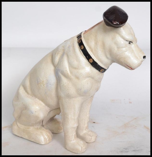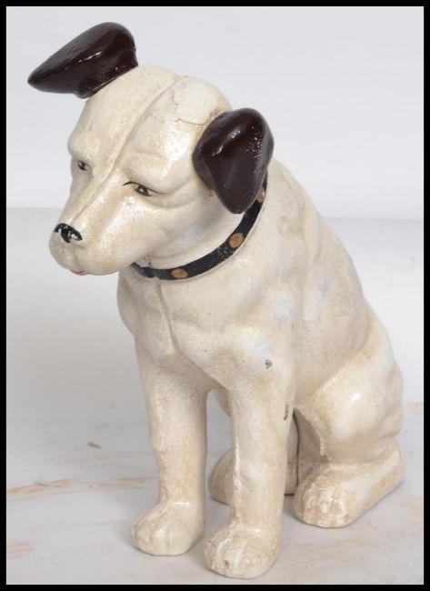 A vintage style cast iron figurine of Nipper the HMV gramophone dog having painted detailing. Measures:  25cm high.