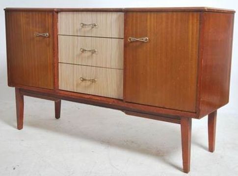 A retro 1960's Danish influence sideboard in teak being raised on tapered legs with two tone finish having drawers and cupboards. Measures 75cm high x 125cm wide x 39cm deep
