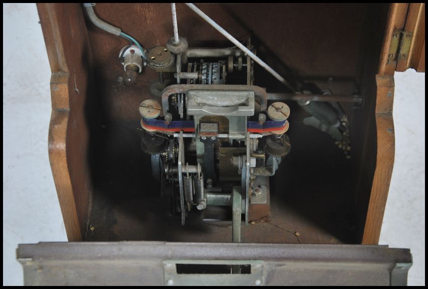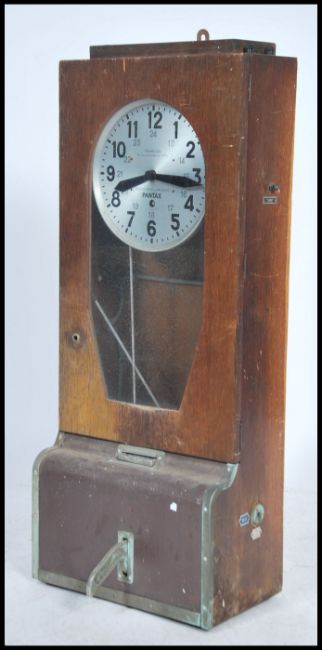 A vintage 20th century industrial factor French wooden cased clocking in / time clock by Pantax having an opening glass door to front with pedal to bottom.