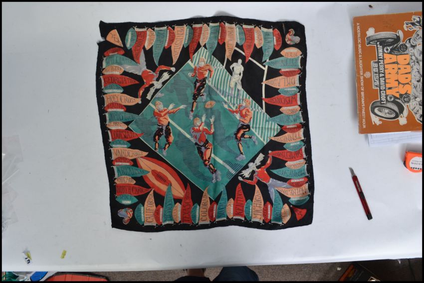 A vintage early 20th century possibly 1930's Silk scarf, featuring pennants from many different  college football teams of the day with a central panel featuring four players and an umpire. 71 different teams in total.