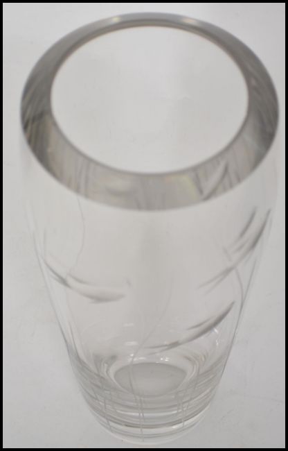 A retro mid century Scandinavian studio art vase of tapering form having an etched decoration depicting fish swimming among reeds with a faceted rim and a polished pontil base. Measures 26cms high.