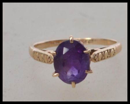 A ladies 9ct gold amethyst set single stone ring. The oval amethyst being claw set, marked 9ct gold to inside of the shank. Total weight 2.5g / Size P