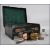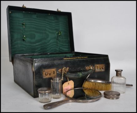 A gentlemans / ladies vanity case with silver hallmarked contents to include  bottles, pots, mirrors, brushes etc. The well stitched dark green'/back case with gilt monogram for BCB. Silver hallmarks for G&S & Co, London hallmarks Measures 41 cms wide.