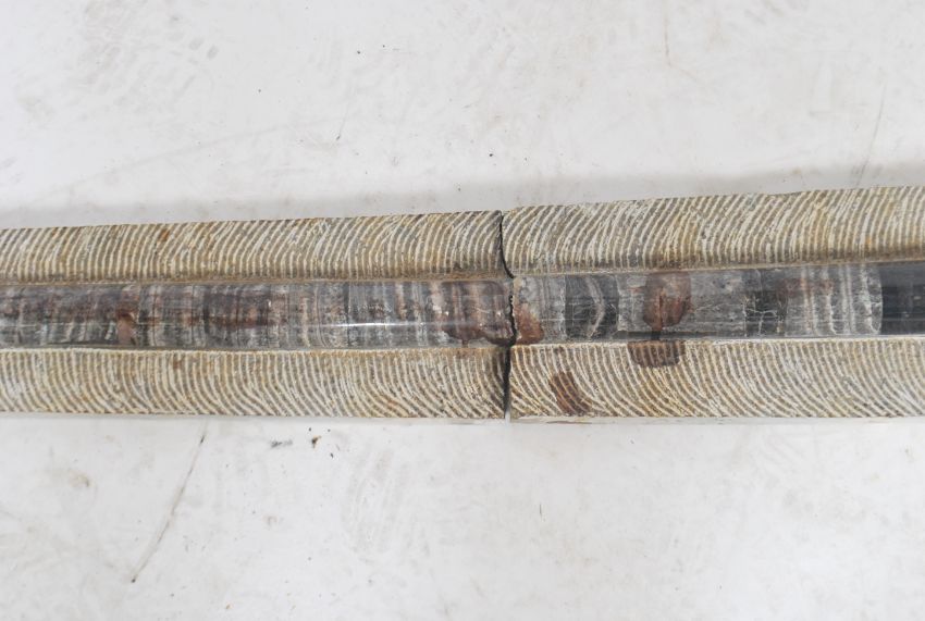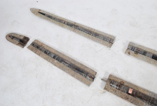 A very large fossilised Orthoceras ( " straight horn " ) of likely Moroccan origin together with another. Each being mounted to concrete slabs  ( please see illustrations ) both with splits as seen