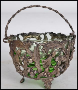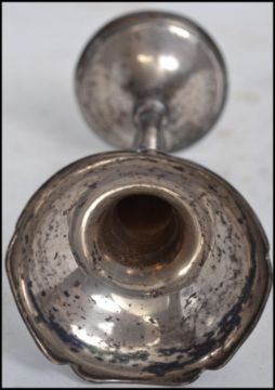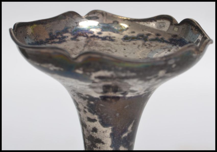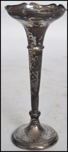 A hallmarked silver solifleur single stem vase raised on a circular base with a tapering knopped stem and fluted flared rim with scalloped edge along with a pierced decorated rococo style silver white metal basket with twist work swing handle atop with green glass liner and a silver white metal spoon of plain form having a ball finial handle. Tallest measures 15cms high.