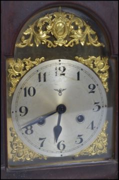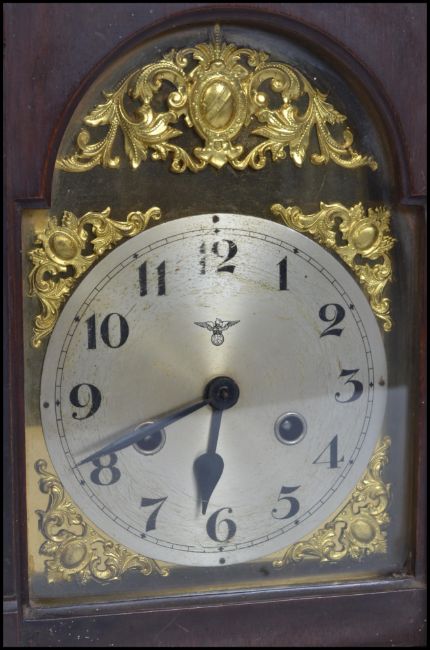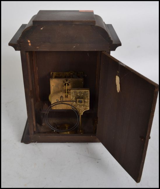 An early 20th century Edwardian English cased bracket clock having a German FMS 8 day movement striking on a gong with pendulum having a silvered dial with Arabic numerals, gilt spandrels.