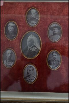An unusual display of Cameo's depicting Queen Victoria and surrounded by famous Generals and people of the era being set within a good gilt framed glass wall display case. Measures: 32cm wide.