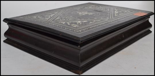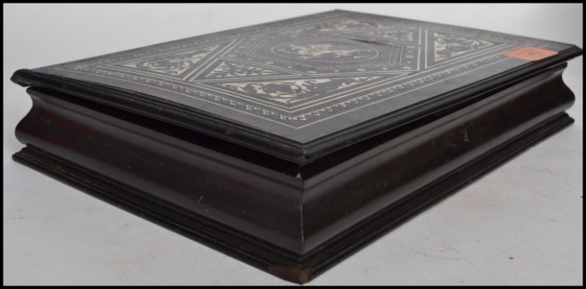 A stunning late 19th century Italian ebony and ivory inlaid workbox in the manner f Fernando Pogliani, Italian, circa 1870. The box with beautiful inlays with armorial rampant lion to centre.