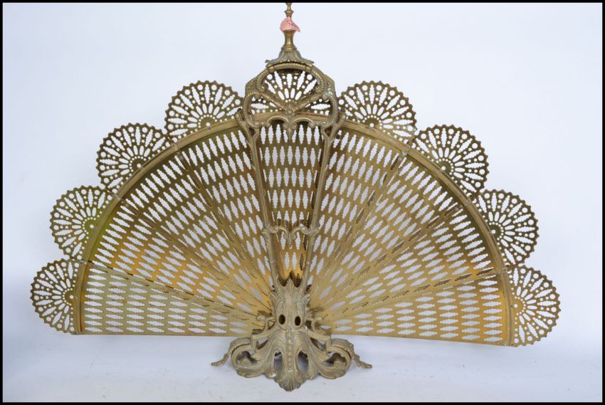 A Victorian style  " peacock feather " brass metamorphic fire-screen, folding in nine segments, pierced and cast detail.