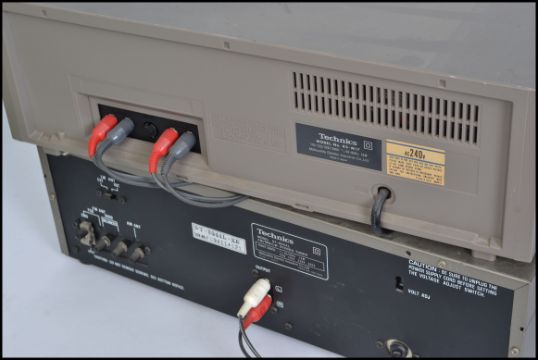 Two vintage retro hi fi Technics amps model ST 8044c having a silver finish with dials and displays to front.