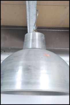 A large 20th century polished aluminium Industrial factory pendant light. The pendant half moon shade of large form 45x65cms