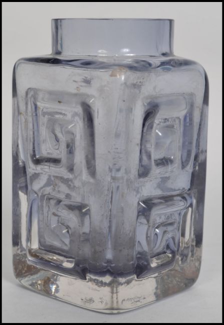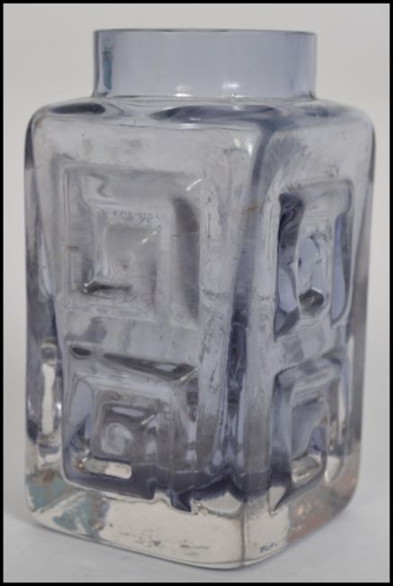 A mid 20th Century Whitefriars Greek Key pattern small studio art glass rectangular vase, pat number 9815, in smokey grey colour, designed by Geoffrey Baxter, height 11cm/ Condition is good. No damage