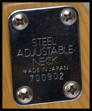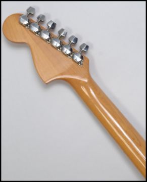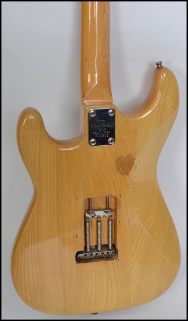 A vintage style 6 string Stratocaster type electric guitar having a shaped body with ebonised fret markers. Measures:  98cm high.