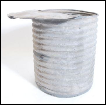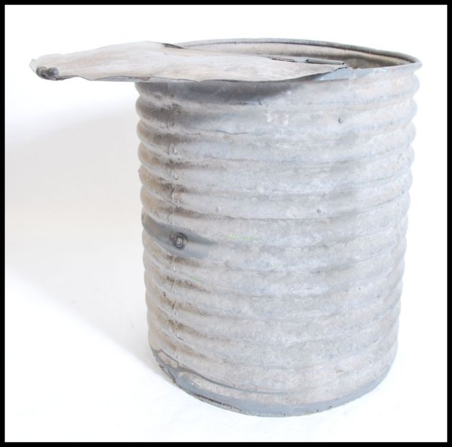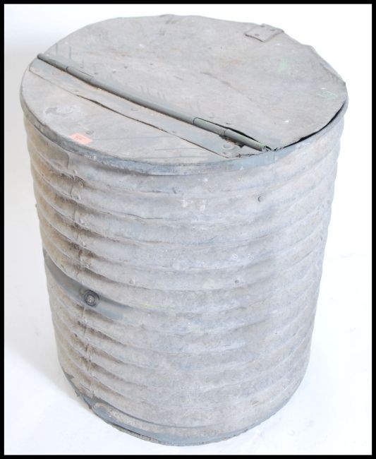 A mid century Industrial corrugated metal  bird grain bin holder of large form, conical shape with circular hinged top above