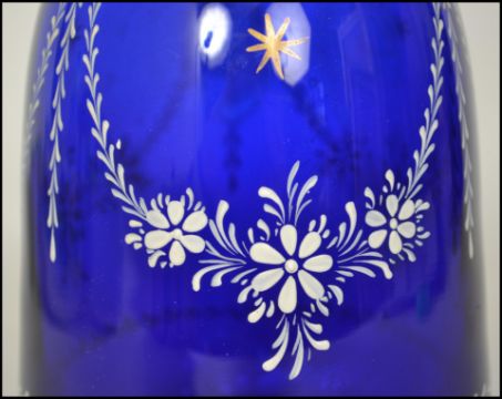 An early 20th century blue glass decanter having a hand painted decoration complete with stopper to top. Measures 35cms high.