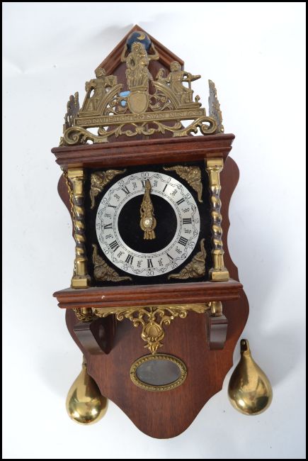 A contemporary burr walnut veneered Dutch wall hanging clock, showing Hercules holding up a globe as finial inscribed ' Nu Elck Syn Sin', the face with Roman numerals, flanked by brass twisted pilasters, cherub embossed spandrels complete with weights and pendulum, German movement