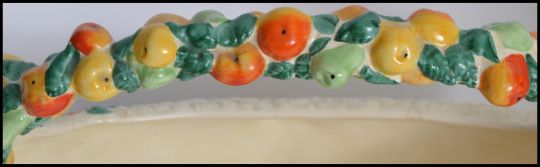 A Clarice Cluff for Newport Pottery basket, ' Celtic Harvest ' design boat shaped with fruit moulded handle, black backstamp, length approximately 33cm x height 23.5cm, together with a matching Clarice Cliff ' Celtic Harvest ' jug again stamped to the base. Measures: 32cm wide.