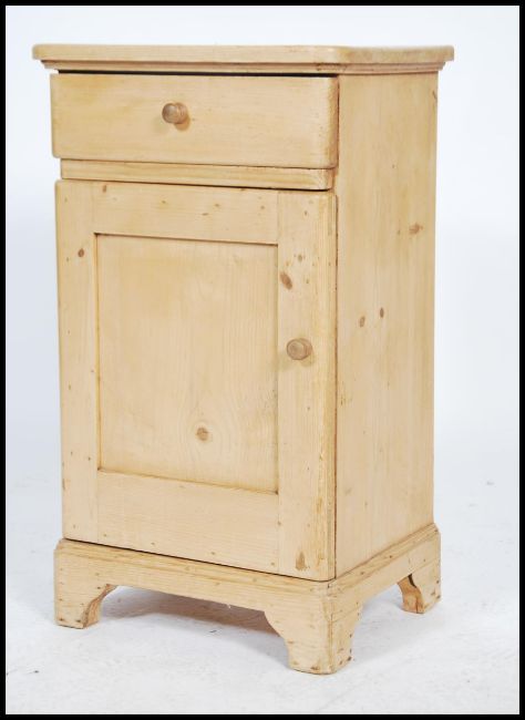 A 19th century continental pine pedestal pot cupboard / bedside cabinet having a single drawer being raised over a locker cupboard beneath.  76cms x 44cms x 35cms
