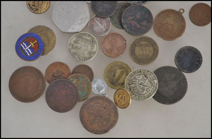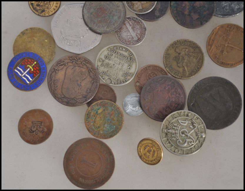 A collection of vintage coins and tokens from around the world dating from the 18th century to include two Great Britain George III (Spade Guinea Jeton) tokens dating to 1790 & 1768, a 1789 The Anglesey Mines Halfpenny, East India Company, One Quarter Anna 1835, Portsmouth Navy Week HMS Victory commemorative coin, Queen Victoria Settlements Straits One Cent coin 1876, Ruffler and Walker, London Slot Machine token, Bon Pour One Franc Industrie etc please see images.