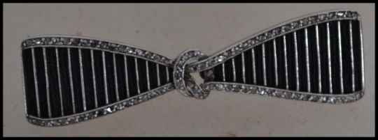 A collection of silver and white metal items to include a white metal brooch set with marcasite in the form of a bow with black silk lining having gold metal back and c clasp together with a sterling silver and enamel spray brooch, a crucifix pendant marked silver,  a pair of BJL enamel and marcasite vintage clip on earrings and a Dusseldorf shield.Measures: 7cm high.