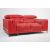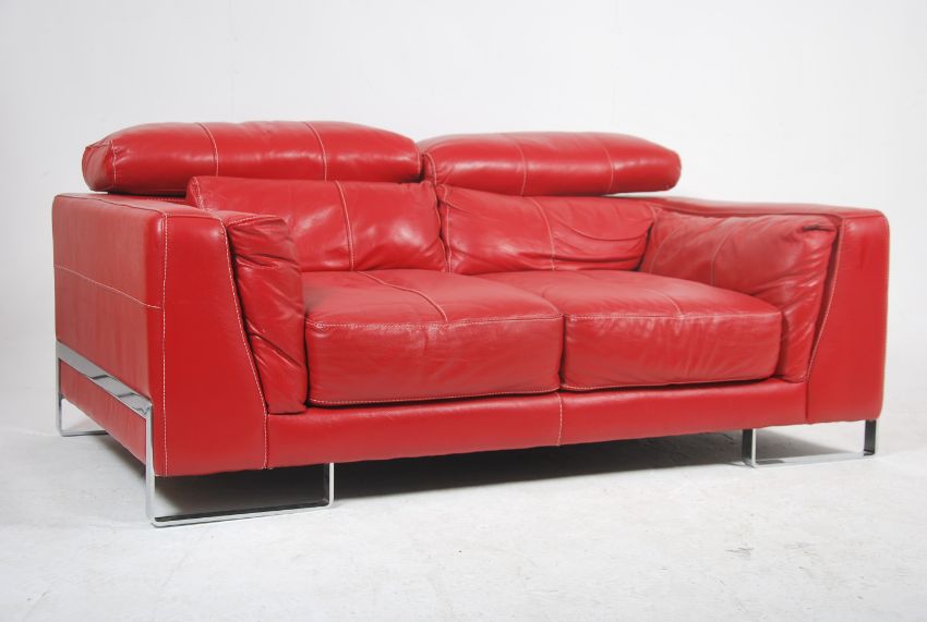A contemporary red leather Italian sofa raised on strap chrome work legs and exterior frame, the deep sofa with re red stitched leather having adjustable head rests. Measures 75cm x 180cm x 110cm
